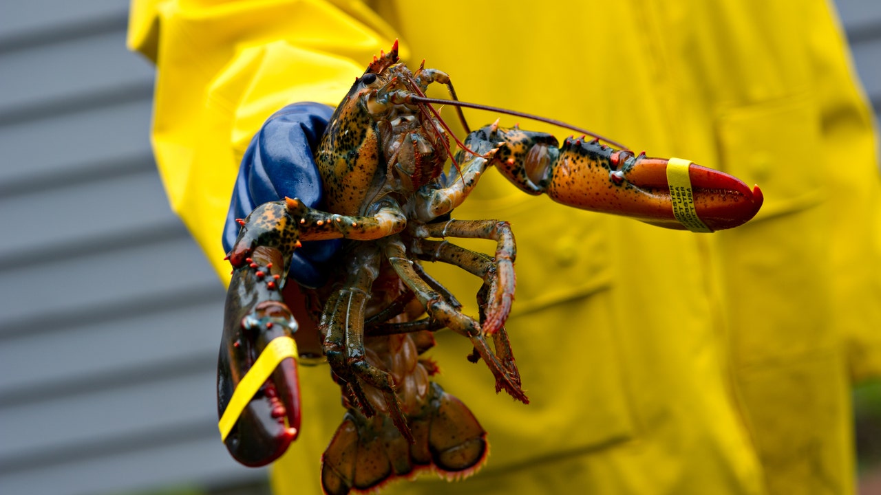 A freshly caught Maine lobster is held up by a fisherman wearing a yellow coat and blue protective gloves.