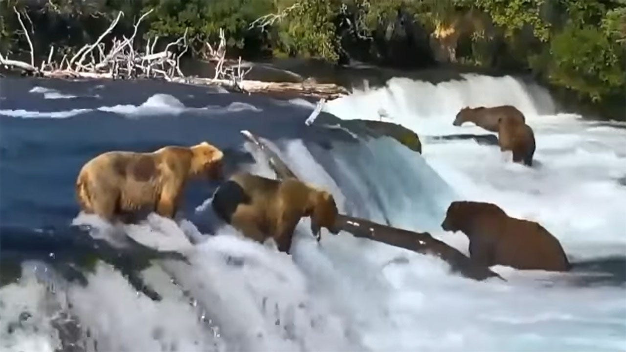 Webcams at a national park in Alaska filmed a group of bears attempting to catch salmon as the fish jumped upstream. Unfortunately for one of the bears, the camera also caught the moment that it slipped and fell down a short waterfall after missing a fish.