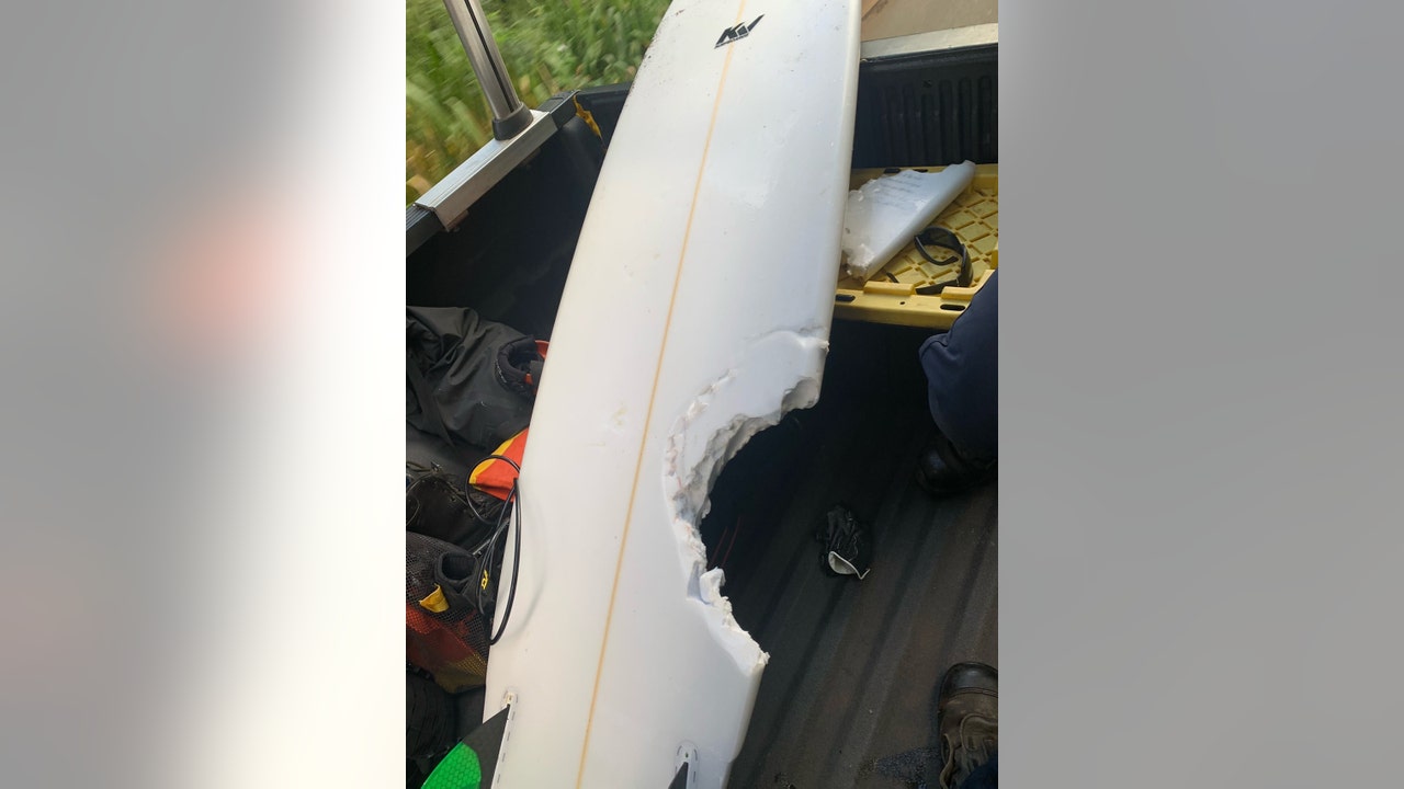 Photos released by Hawaii’s DLNR show the surfer’s damaged board, which appears to have an 18-inch bite taken out of its right side. (Hawaii Department of Land and Natural Resources)