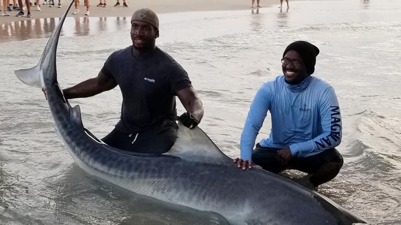 According to the post, after "two uneventful nights on the pier," Andrew was in "disbelief" on Sunday morning as he saw 200 yards of his line “taken effortlessly” by an unknown creature, the Chronicle reported. After more than 30 minutes of struggle, the Seaborns and their pal Allen Glen reeled in the majestic tiger shark.