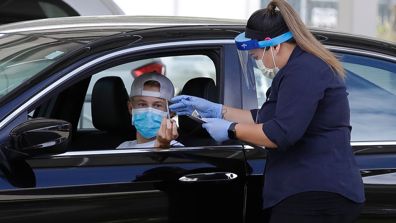 A health care worker takes information from a person at a COVID-19 testing center on July 21, 2020, in Pleasanton, Calif. (AP Photo/Ben Margot)