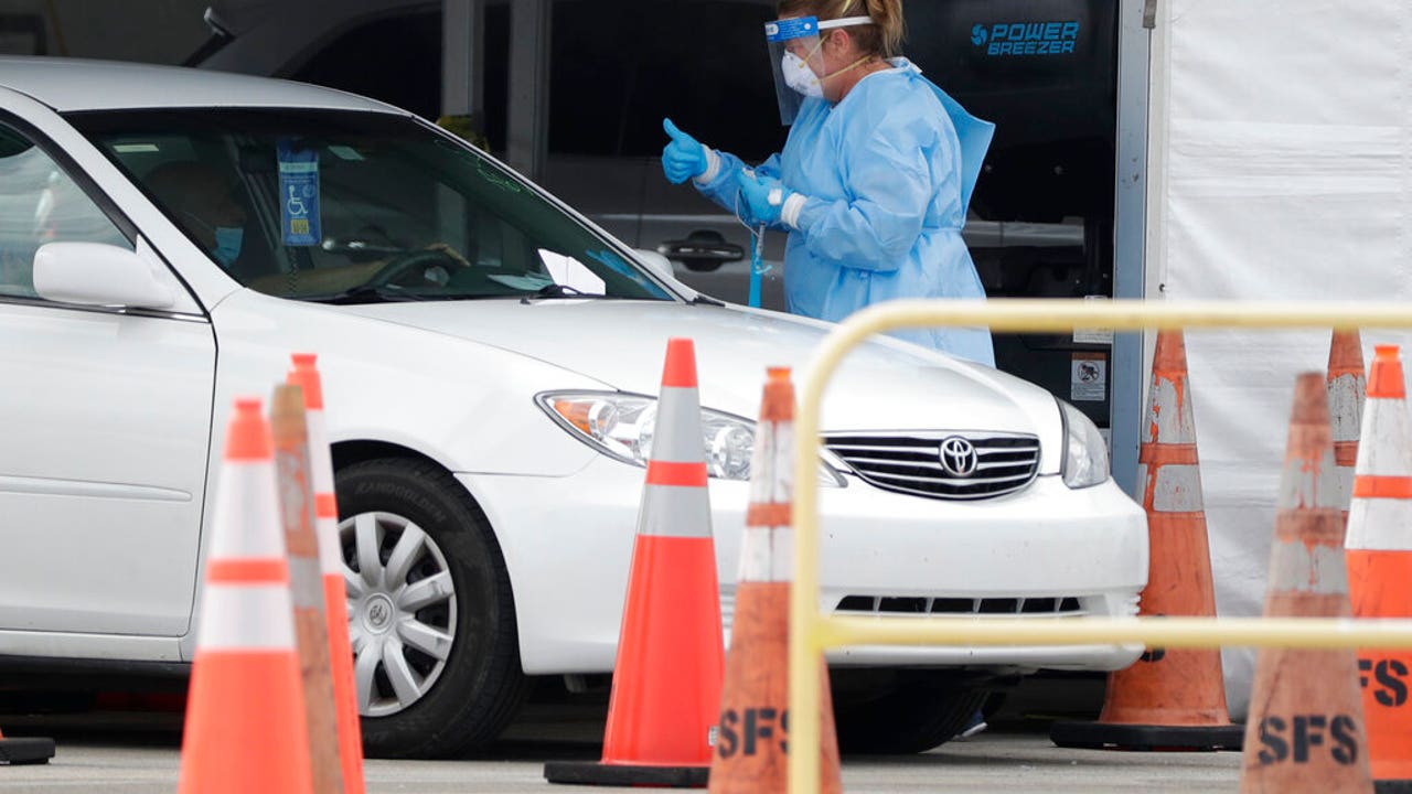 A health-care worker at a drive-through coronavirus testing site Sunday in Miami Gardens, Fla. (AP)