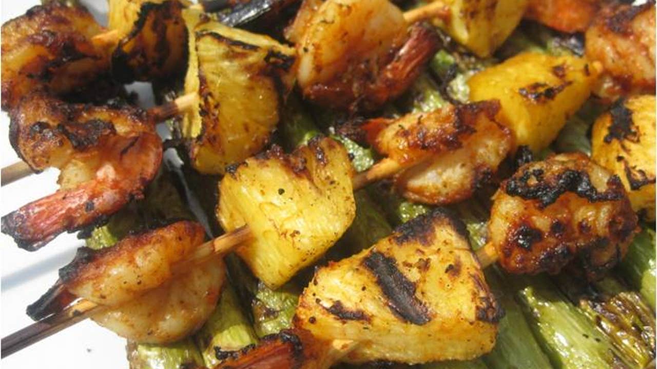 5. Preheat grill on medium. Skewer shrimp and pineapple.