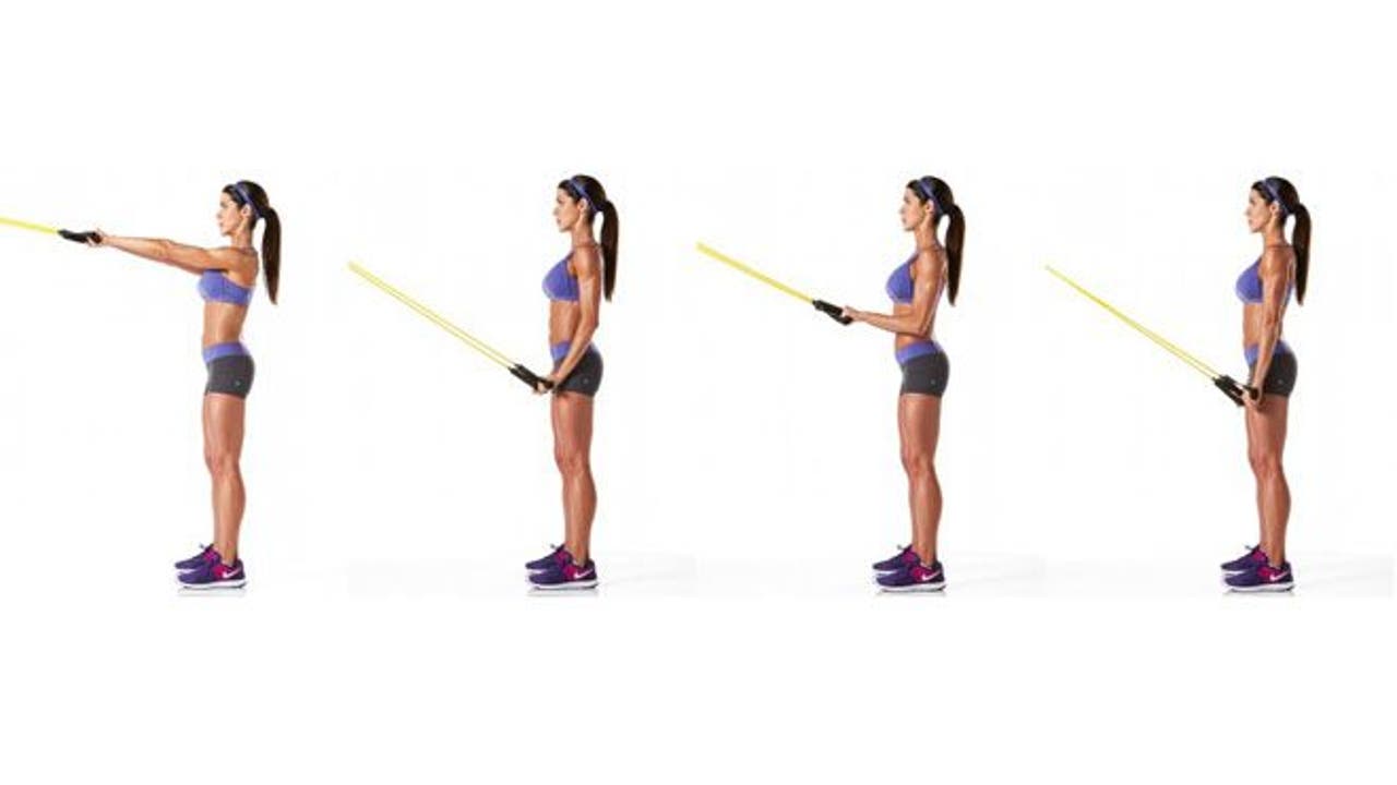 - For this routine, you’ll need dumbbells, barbells, and tubing or a cable pulley at the gym.