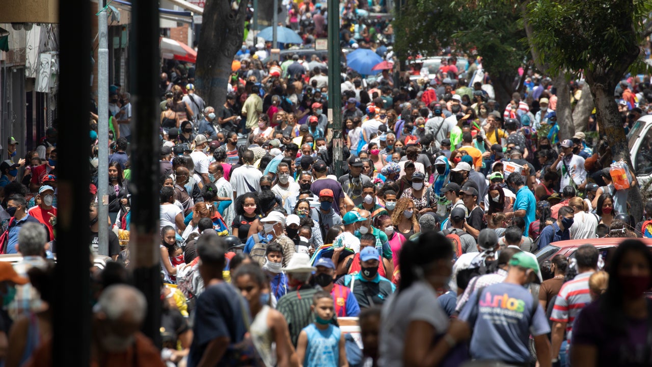 People, some wearing face masks as a measure to curb the spread of the new coronavirus, walk in the Catia neighborhood of Caracas, Venezuela, Saturday, June 20, 2020, during a relaxation of restrictive measures amid the new coronavirus pandemic. (AP Photo/Ariana Cubillos)