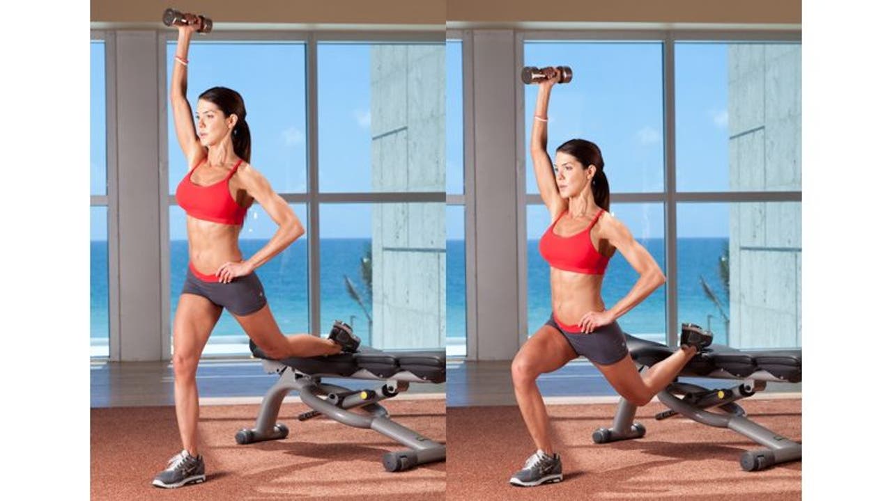 Asymmetrical Bulgarian: You can either hold the dumbbell overhead or by your side. Raising it further engages the core. Place one foot on a bench behind you and lower your body using the strength of the forward leg, which should comfortable be at about 90 degrees in the bottom position.