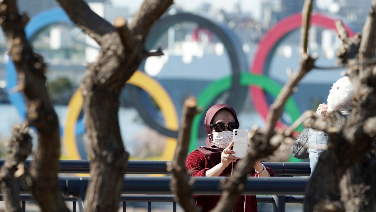 A tourist wearing a protective mask takes a photo with the Olympic rings in the background Tuesday, March 3, 2020, at Tokyo's Odaiba district. The spreading virus from China has put the Tokyo Olympics at risk. The Olympics are to open on July 24 - less than five months away. (AP Photo/Eugene Hoshiko)