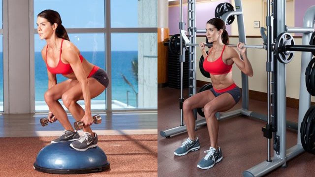 Switch it: Instead of doing lunges and squats on a stability ball, do them on a regular surface. If you want to add greater engagement of the core, use dumbbells or barbells instead of the Smith Machine.