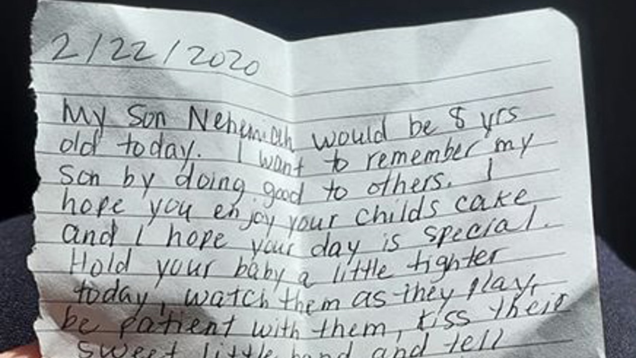 “My son Nehemiah would be 8 years old today,” the note read, according to a photo Grimet shared to Facebook. “I want to remember my son by doing good to others. I hope you enjoy your child’s cake and I hope your day is special. Hold your baby a little tighter today, watch them as they play, be patient with them, kiss their sweet little hand and tell them how much you love them. Our children are such beautiful gifts! I hope your day is beautiful. Much love from me and my angel in heaven to your family.”