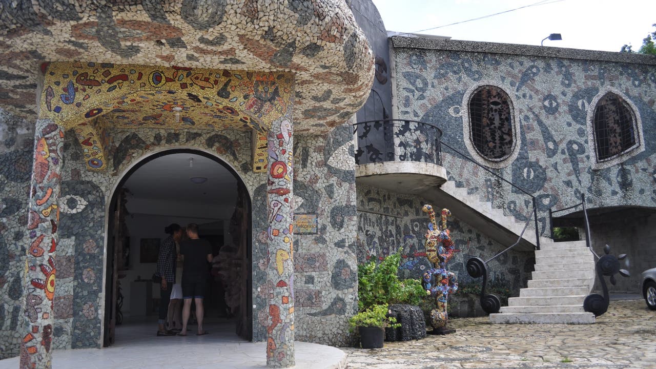 It stands out from other homes thanks to the sculptures adorning the fence and the mosaic tiles that cover the house’s façade. The front door is an intricate metal sculpture with eyes and hands and faces as its main subject matter.
