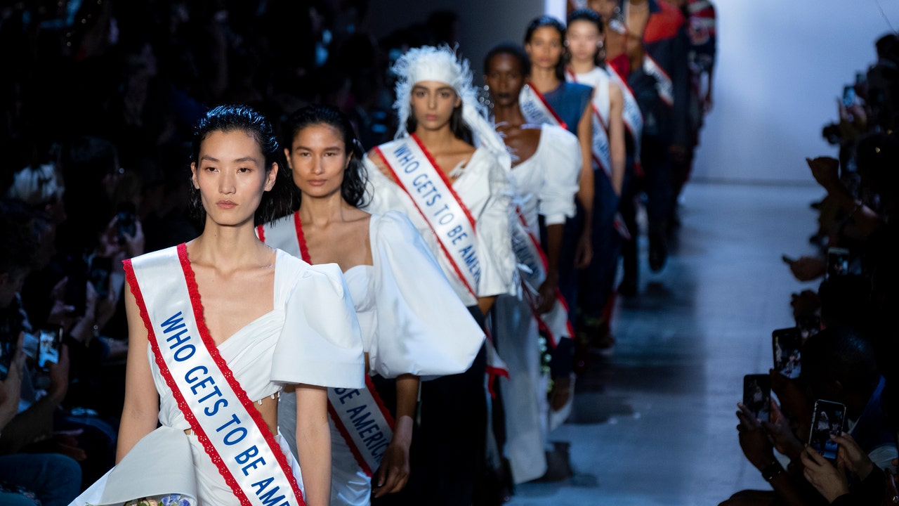 The epic show concluded with every model walking the runway with a pageantlike sash that read "Who Gets to be American?" in blue letters.