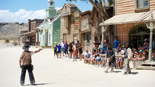 With classic blockbuster films such as "Indiana Jones and the Last Crusade" and "Lawrence of Arabia" filmed in and around Almeria – along with many movies in Sergio Leone's Spaghetti Western genre – the Old West set, dubbed Fort Bravo/Texas Hollywood, now hosts daily shows for visitors, including a Can-Can act in the saloon, an American-style cowboy fight and a bank robbery action sequence in the middle of the dusty main street.