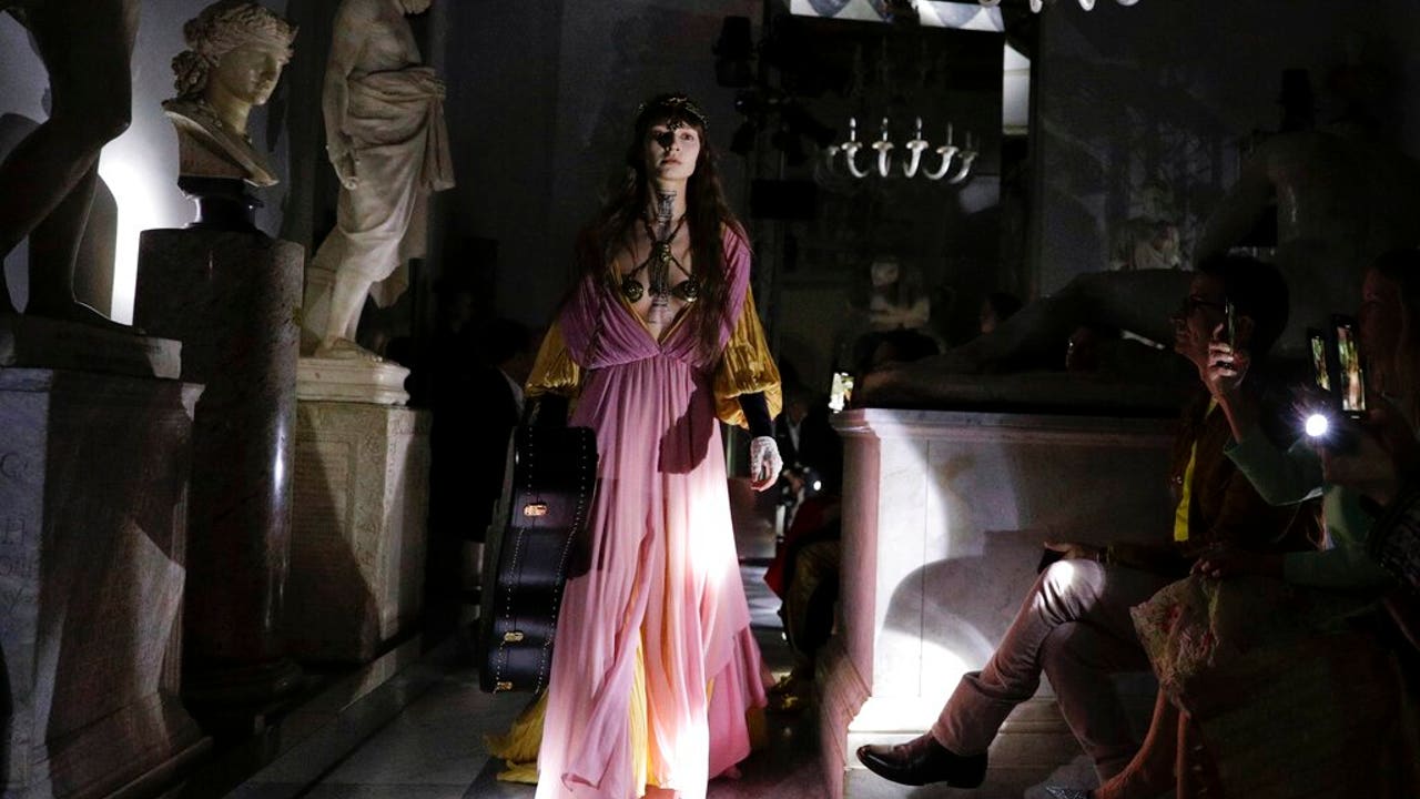 A model wears a creation as part of the Gucci cruise collection that was presented at the Capitoline Museums in Rome. (AP Photo/Andrew Medichini)
