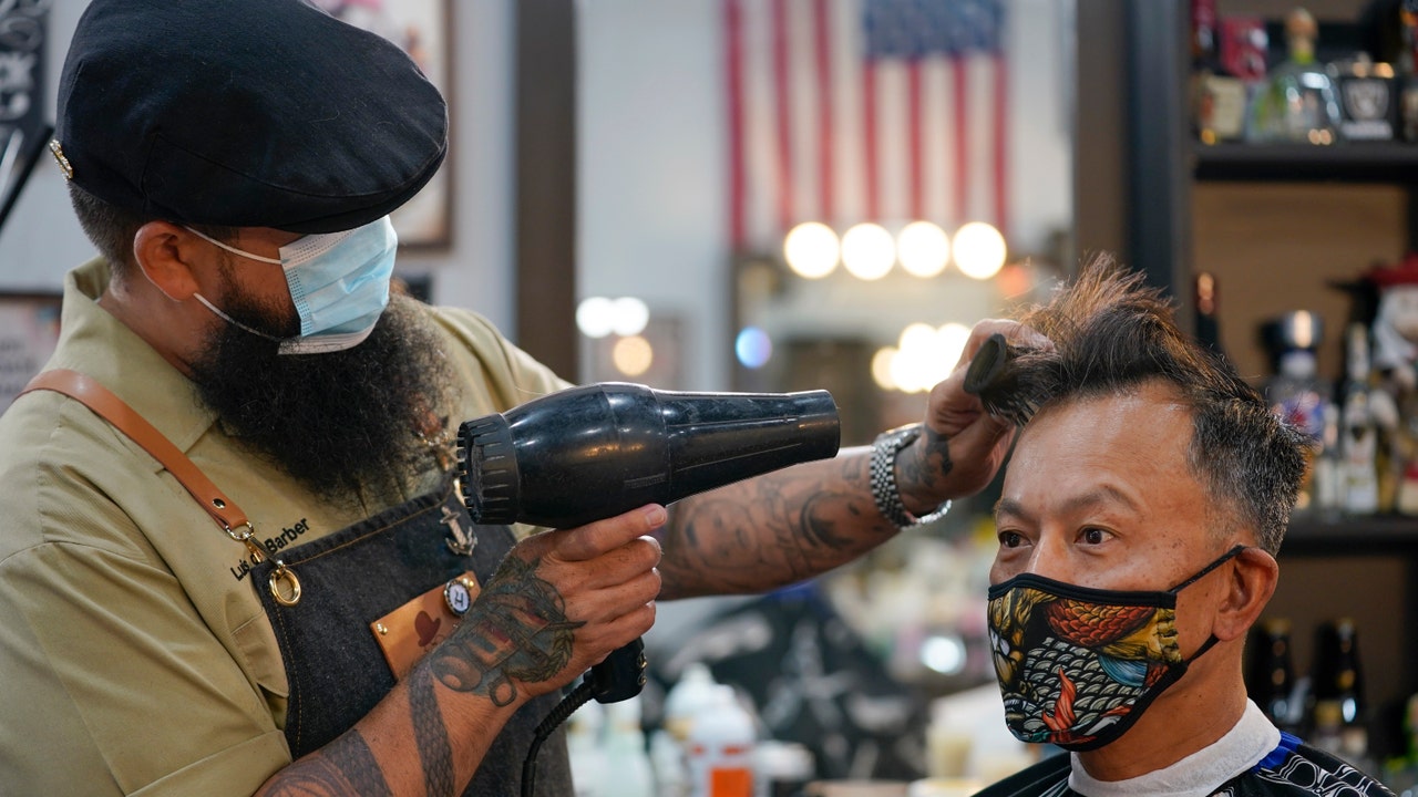Luis Lopez wears a face mask while giving a hair cut to Alexander Chin at Orange County Barbers Parlor on May 27. (AP Photo/Ashley Landis)