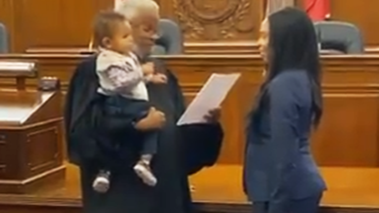 State Court of Appeals Judge Richard Dinkins is seen bouncing the toddler in one arm as he reads the oath of admission to mother Juliana Lamar, who was being sworn in as an attorney.