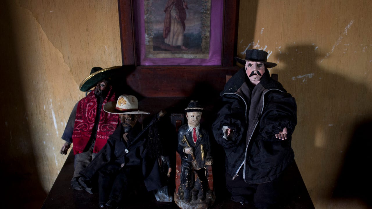 At times, his effigy is dressed more like a bandit than a saint, wearing aviator sunglasses, a bandanna and a fedora. Other times, he has a business suit and a cowboy hat adorned with red and green feathers.
