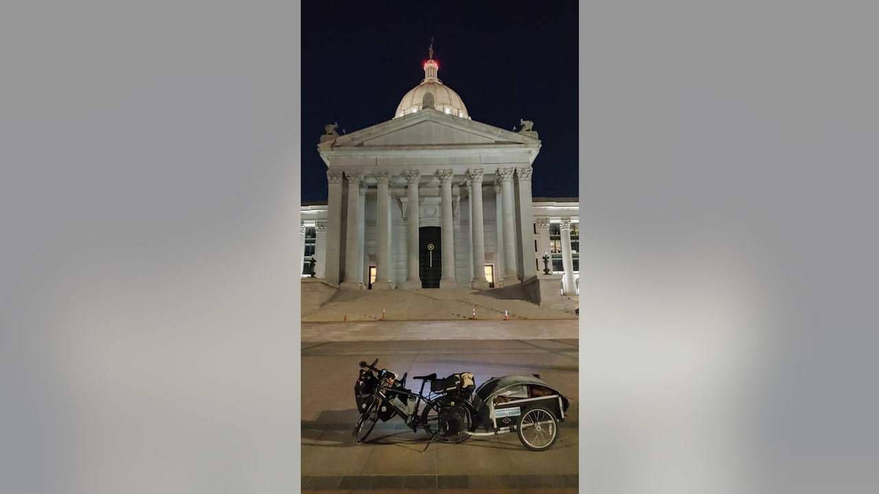 Barnes told Fox News Digital that on Monday that when he arrived in Oklahoma City, lawmakers were starting their session, which began with a State of the State address, the fourth for Oklahoma Gov. Kevin Stitt, a Republican. Barnes' bicycle and trailer are pictured here in front of the Statehouse. (Bob Barnes)