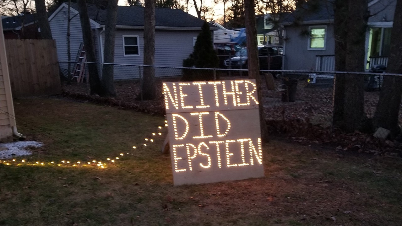 In his yard, there are also two signs adorned with lights. One says, “These lights didn’t hang themselves.” The other adds, “Neither did Epstein.”