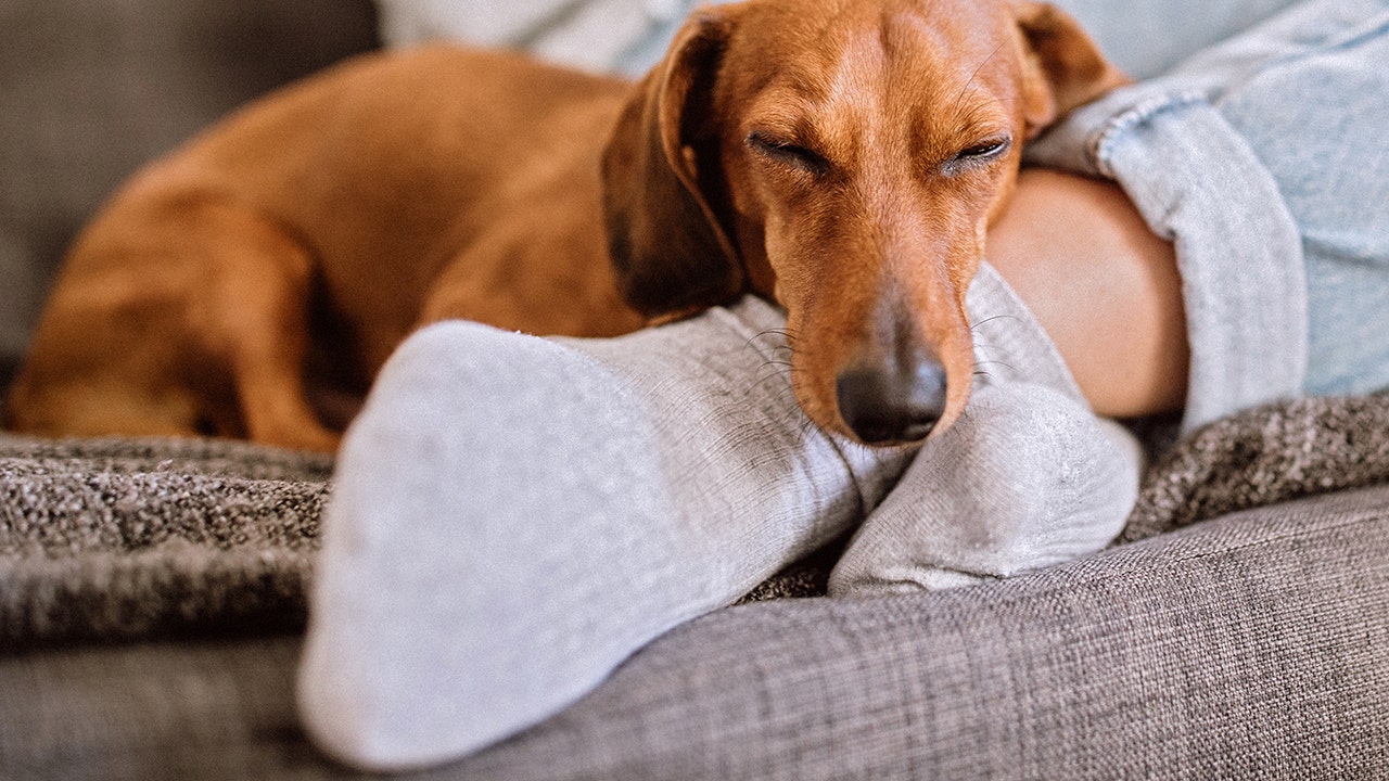 The dachshund is perfectly positioned in front of the woman’s face, creating the perfect illusion of a human with a dog’s nose and mouth.