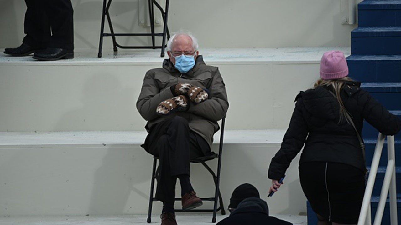 Ellis, a Vermont elementary school teacher who has a side business making mittens out of recycled wool, gave Sanders a pair as a gift, and he wore them to President Joe Biden's inauguration. His fashion look, also featuring a winter jacket made by Burton Snowboards, sparked countless memes prompted by the photo taken by Agence France-Presse: The former presidential candidate could be found on social media timelines taking a seat on the subway, the moon, and the couch with the cast of "Friends," among other creative locales.