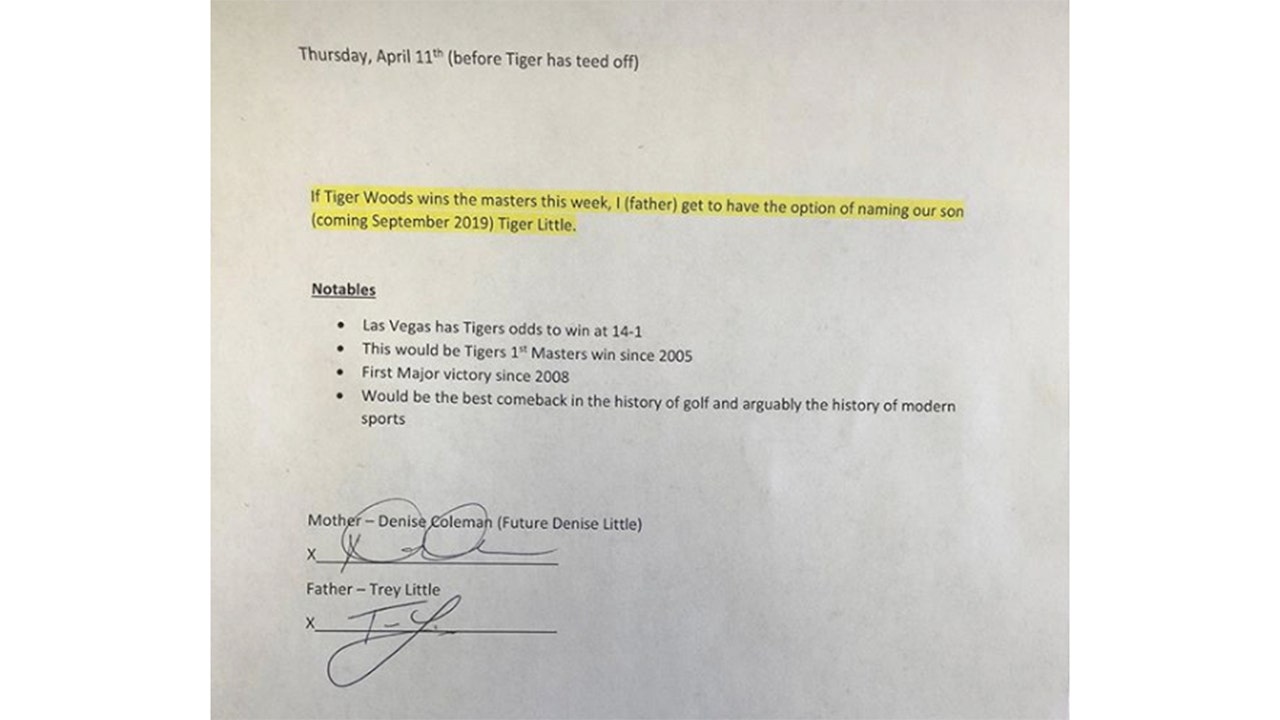 “If Tiger Woods wins the Masters this week, I (father) get to have the option of naming our son (coming September 2019) Tiger Little,” reads an agreement Trey drafted the morning before Tiger teed off in Augusta.