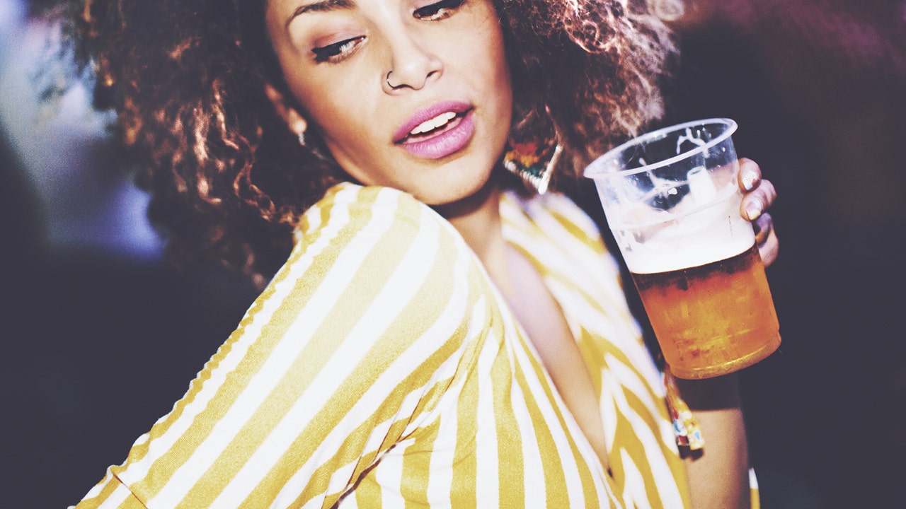 Closeup of an attractive mixed race woman dancing at a party while holding a cup of beer and looking sideways.