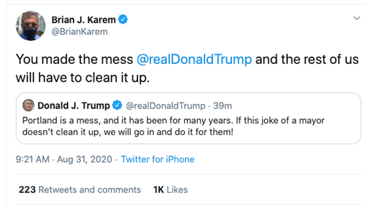Playboy's White House correspondent Brian Karem blamed chaos in Portland on President Trump, tweeting “the rest of us will have to clean it up.”