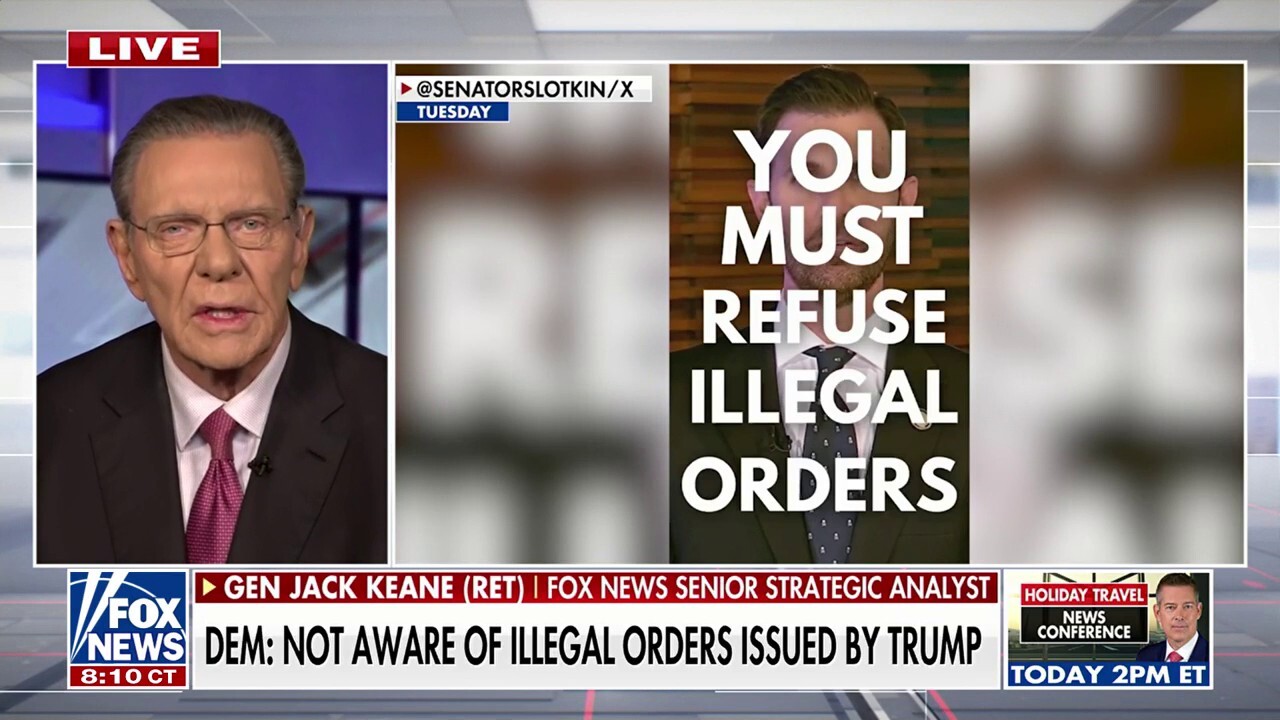 Retired Gen. Jack Keane tore into congressional Democrats after a group of lawmakers released a video urging U.S. service members to "refuse illegal orders" from the Trump administration, a message he called "irresponsible," "reckless" and an affront to the military chain of command.
