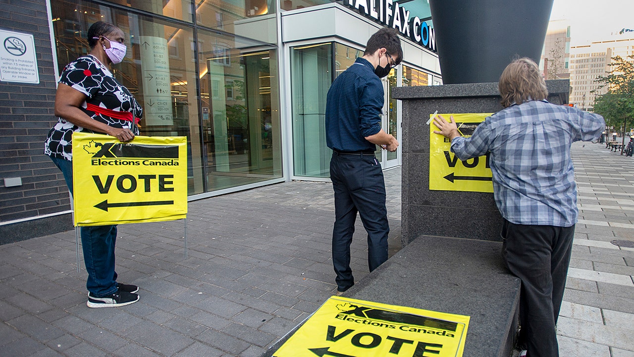 Elections Canada workers place signage at the Halifax Convention Centre as they prepare for the polls to open in the federal election in Halifax on Monday, Sept. 20, 2021. (Andrew Vaughan/The Canadian Press via AP)