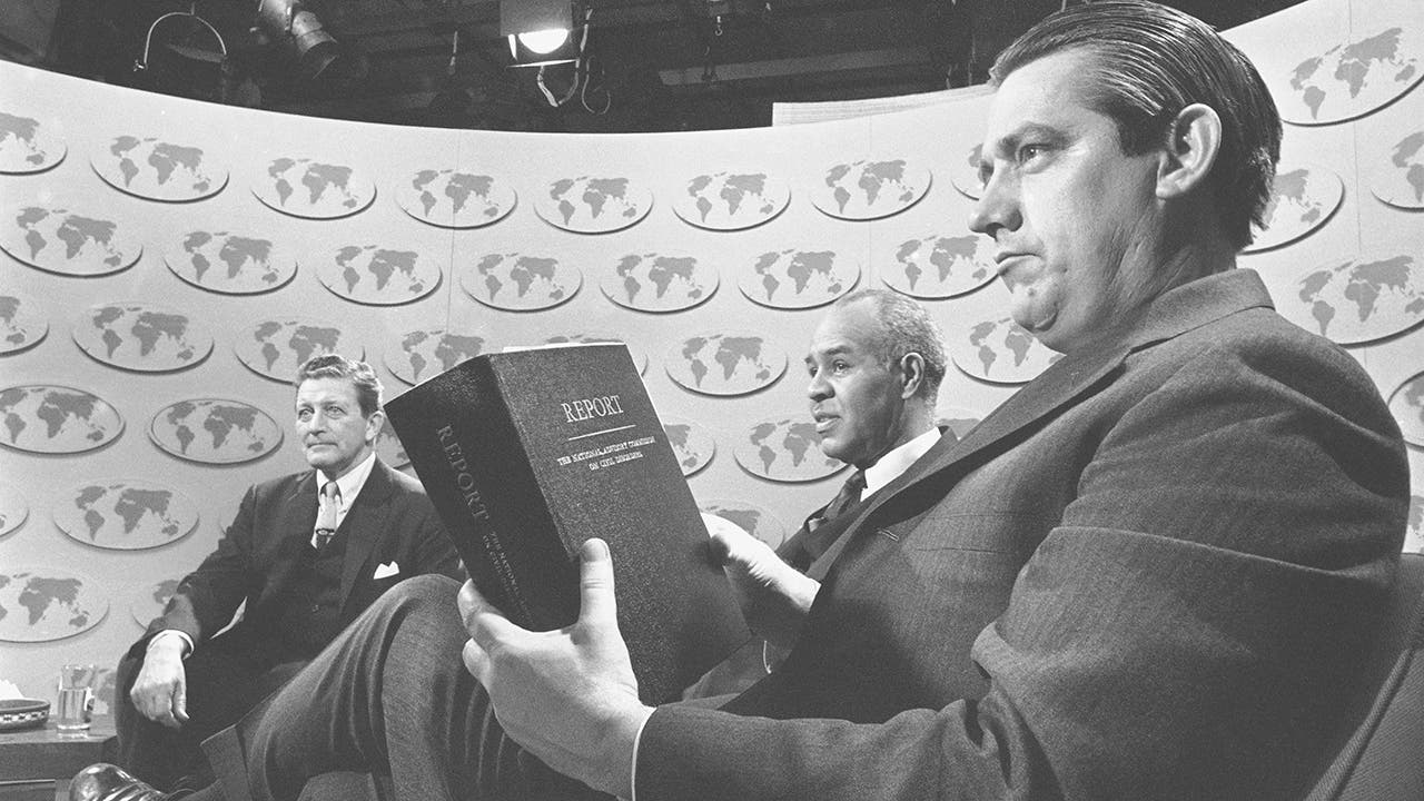 Sen. Fred R. Harris, D-Okla., holds a copy of the report of the National Advisory Commission on Civil Disorders as he and two other members of the commission discuss the study on the television-radio program "Issues and Answers," in Washington, March 3, 1968. (AP Photo/Bob Daugherty, File)
