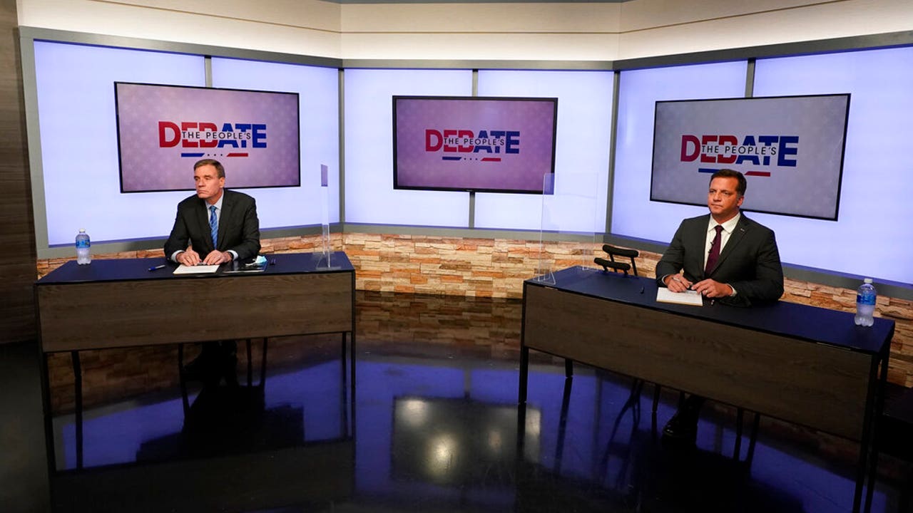 U.S. Sen. Mark Warner, D-Va., left, and Republican challenger Daniel Gade, right, prepare for a debate at a television studio Oct. 13, in Richmond, Va. (AP Photo/Steve Helber)