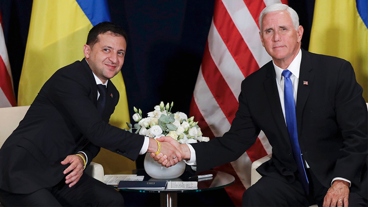 Ukraine President Volodymyr Zelenskiy shakes hands with Vice President Pence in Warsaw on Sept. 1. (AP Photo/Petr David Josek)
