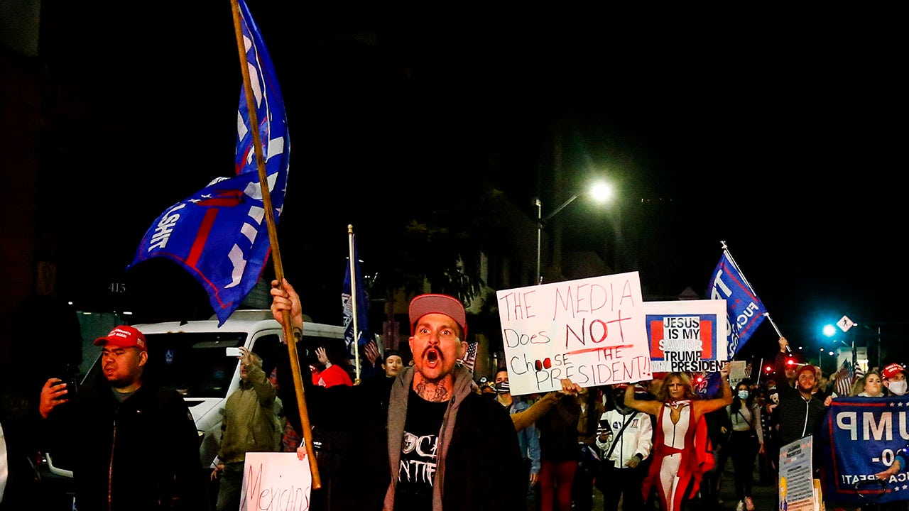 Trump supporters again gathered at a neighborhood park on Saturday, where a sign hung advocating for the recall of California’s Democratic Gov. Gavin Newsom. The event kicked off just as crowds a few miles away began celebrating major news outlets declaring a projected presidential victory for Biden.