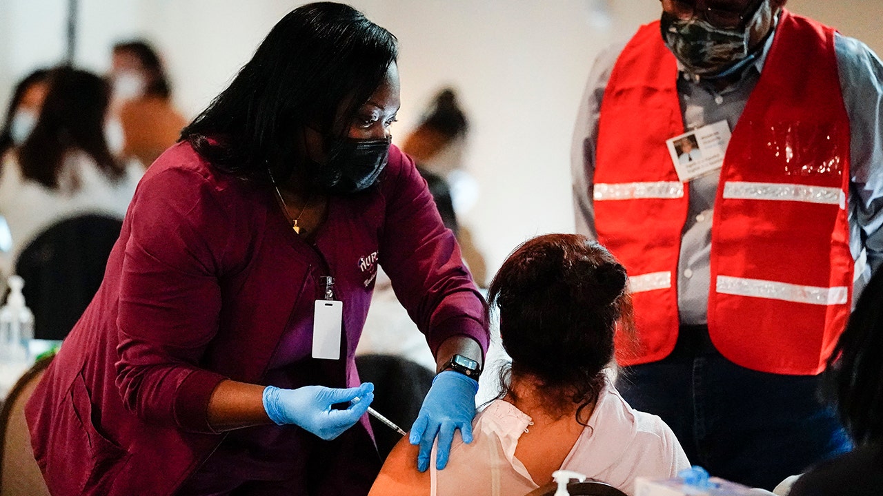 FILE - In this March 17, 2021, file photo, health worker administers a dose of a Pfizer COVID-19 vaccine during a vaccination clinic at the Grand Yesha Ballroom in Philadelphia. (AP Photo/Matt Rourke, File)