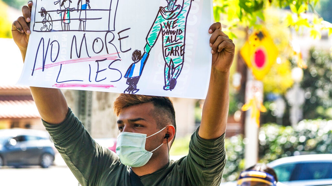 A man holds a sign at the "Reunite Our Families Now!'' rally to protest continued deportations, demanding family and children reunifications in Los Angeles, March 6, 2021. (AP Photo/Damian Dovarganes) ((AP Photo/Damian Dovarganes))