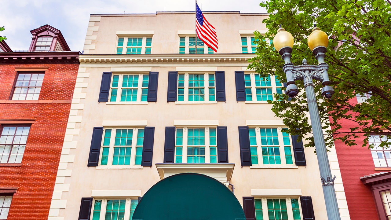 Blair House Building Second White House, Washington DC. Presidents-elect before inauguration live in the Blair House across from the White House. Site of Assassination attempt on President Truman Wreath is for Leslie Coffelt, Washington DC Officer killed in assasination attempt. (iStock)