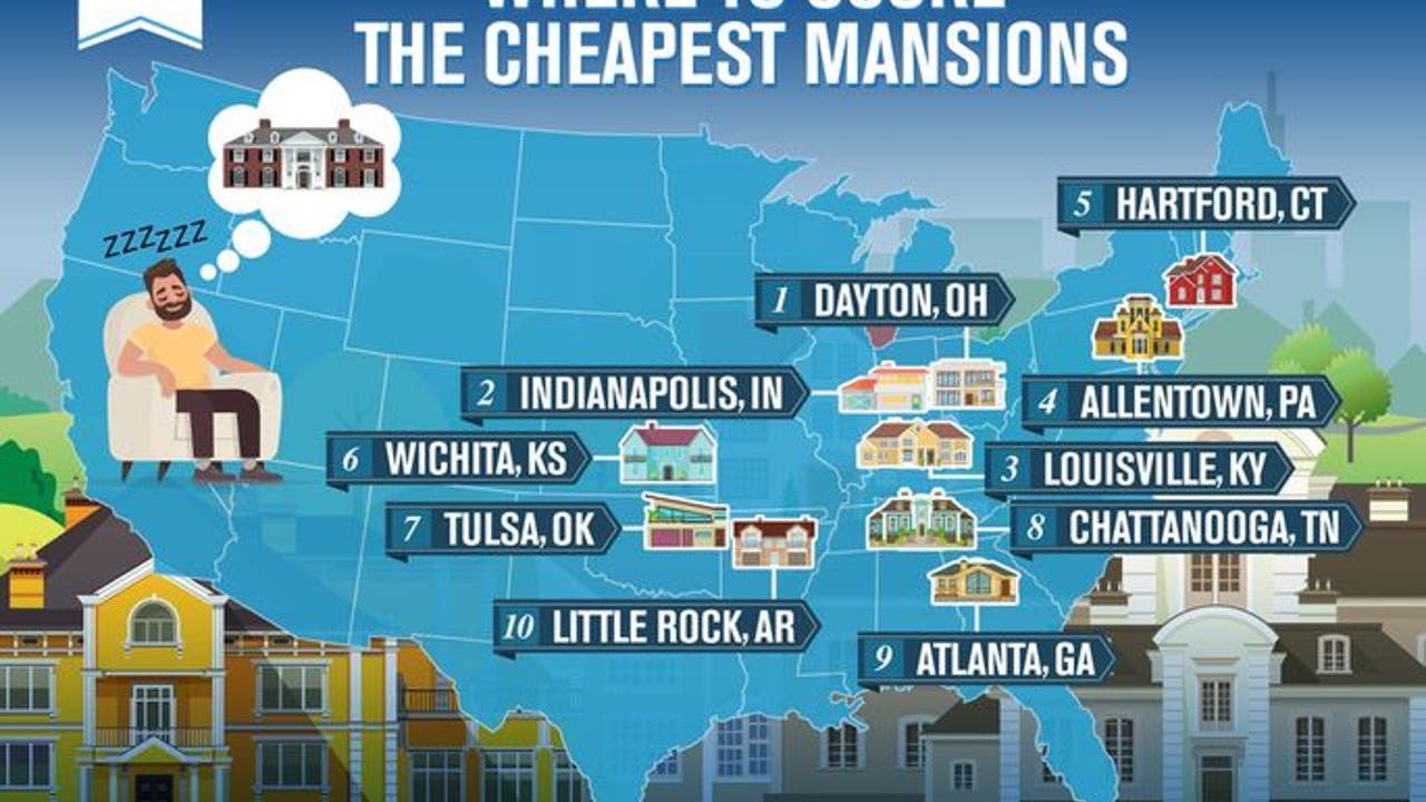 To find out where buyers can get the most mansion for their moolah, we searched for the cities with the most affordable homes of 5,000 square feet or larger on realtor.com. They had to have at least 100 mansion listings to be included in our ranking, and we limited our list to just one city per state to achieve geographic diversity.
