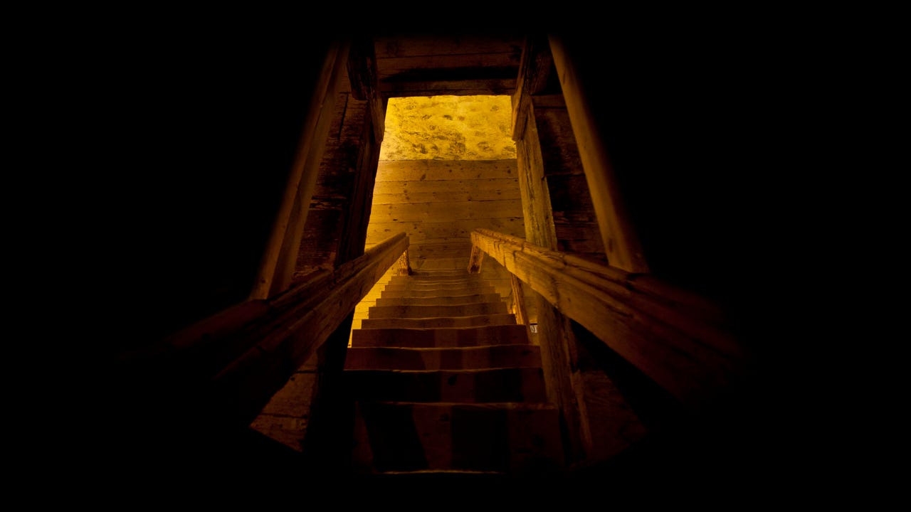 Wilkes then lifts up the countertop, revealing an empty space. He then opens the fake cabinet door, which reveals a staircase hidden behind the kitchen counters. The stairs lead to a door to the outside of the building.