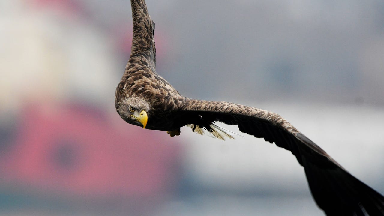 A white-tailed sea eagle flys over the Zolotoy Rog Bay in Russia. (Getty Images)