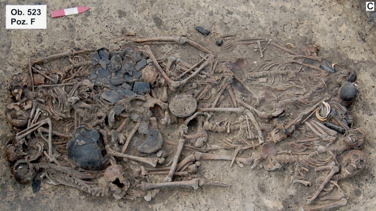 The 5,000-year-old mass grave in southern Poland was first unearthed in 2011 and contained the remains of 15 men, women and children, and some other burial items.