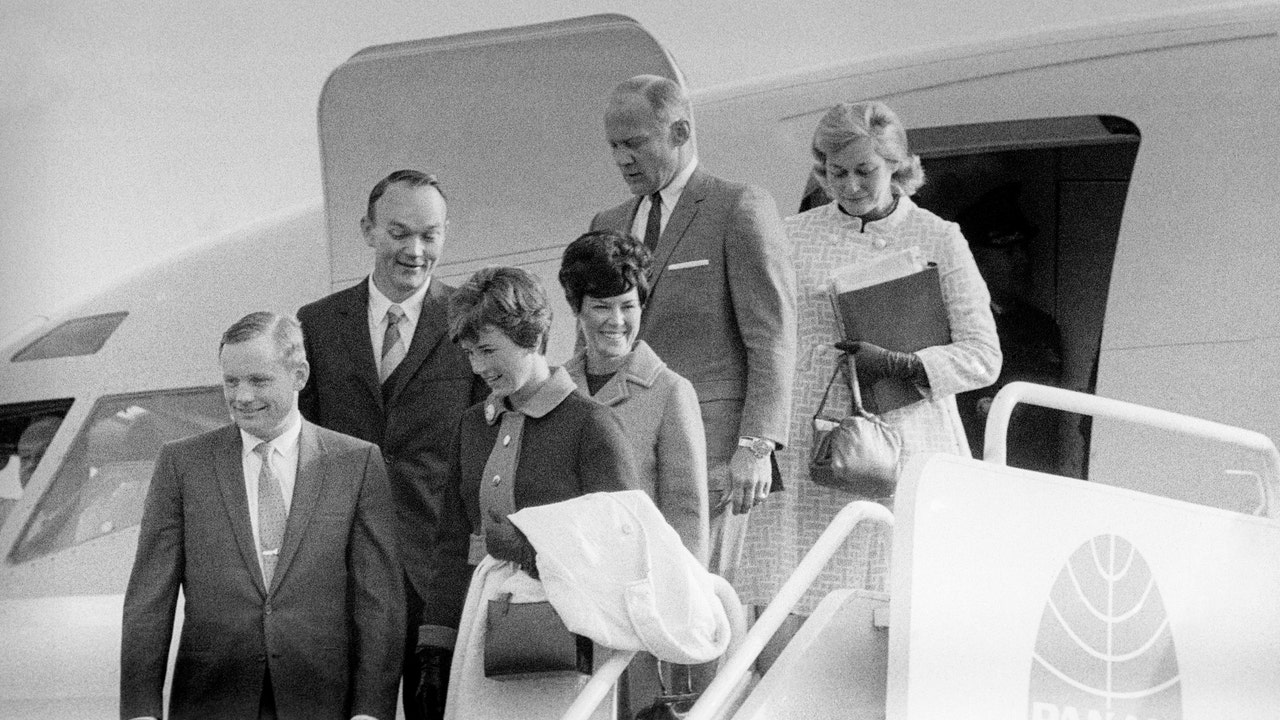 File photo - The Apollo 11 astronauts and their wives leaving the Presidential aircraft at Heathrow Airport in London during their "Giant Leap" global goodwill tour. Neil Armstrong is accompanied by his wife Janet, who can be seen the lunar brooch on her lapel. (Photo by PA Images via Getty Images)