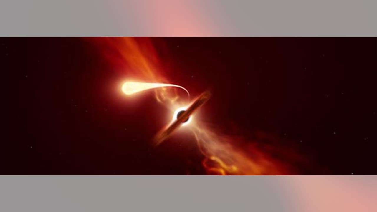 This illustration depicts a star (in the foreground) experiencing spaghettification as it's sucked in by a supermassive black hole (in the background) during a 'tidal disruption event.' In a new study, done with the help of ESO's Very Large Telescope and ESO's New Technology Telescope, a team of astronomers found that when a black hole devours a star, it can launch a powerful blast of material outwards. Credit: ESO/M. Kornmesser