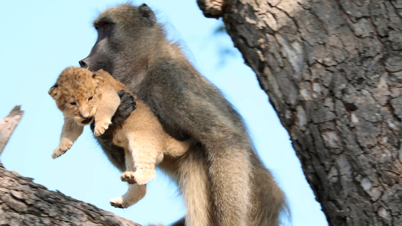 The guide said that he caught the scene early Saturday, after seeing a troop of baboons acting excited and animated. It is possible they had discovered the lion cub, he explained.