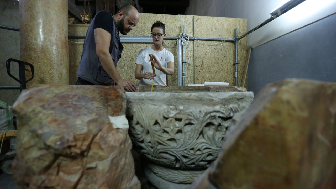 The baptismal font was discovered during restoration work at the Church of the Nativity. (Photo by Wisam Hashlamoun/Anadolu Agency/Getty Images)