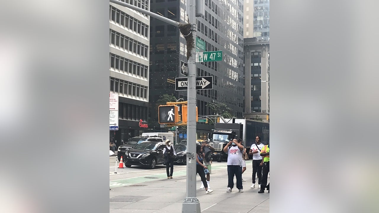 The bees were seen earlier in the day gathering and swarming around the pole on 47th Street and the Avenue of the Americas, also known as 6th Avenue, prompting onlookers to stop and snap photos, at a safe distance of course.