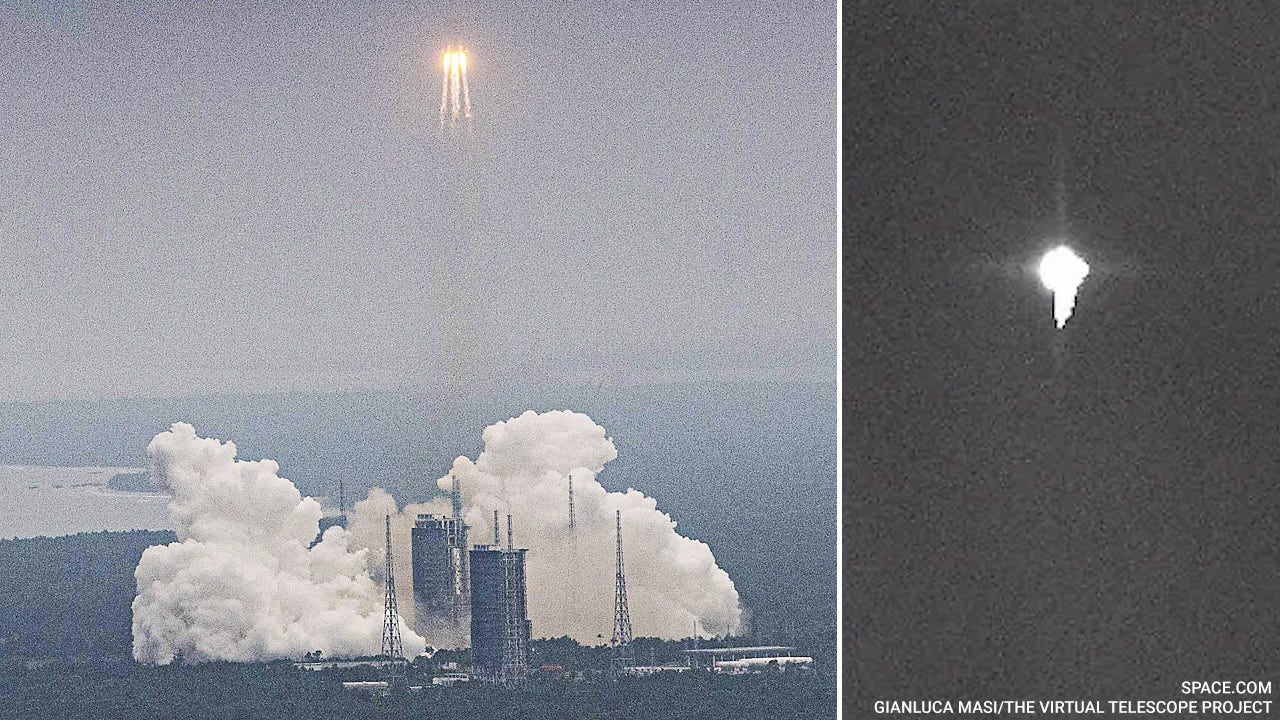Gianluca Masi, who runs the online Virtual Telescope Project, took a 0.5-second exposure photo of the fast-moving Long March 5B rocket from Italy using the "Elena" 17-inch Paramount robotic telescope.