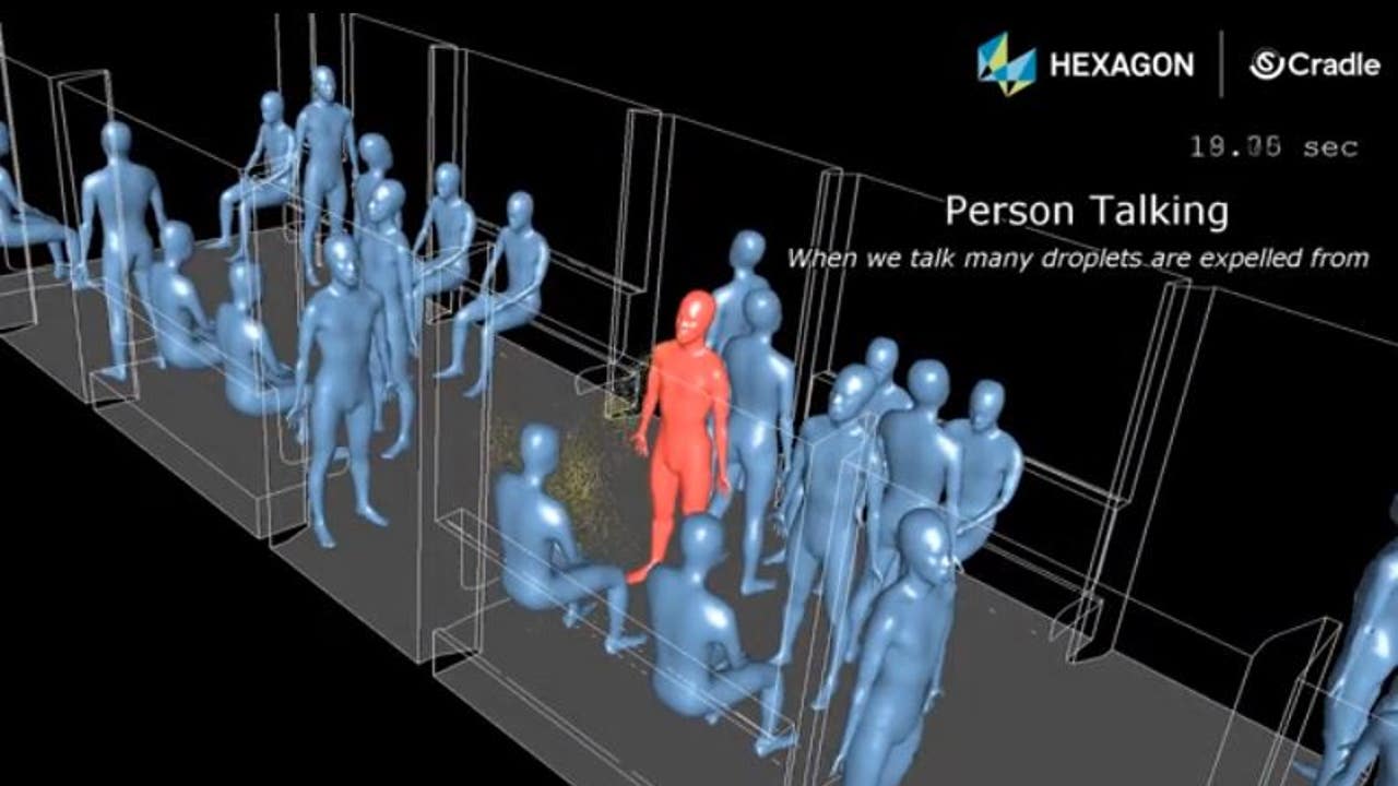 The simulation, created by scientists at the University of Oregon using technology produced by MSC Software, shows how an infected person talking to someone up close on the London Tube or the New York City subway would potentially spread the virus if there is a failure to social distance and cover one's mouth.