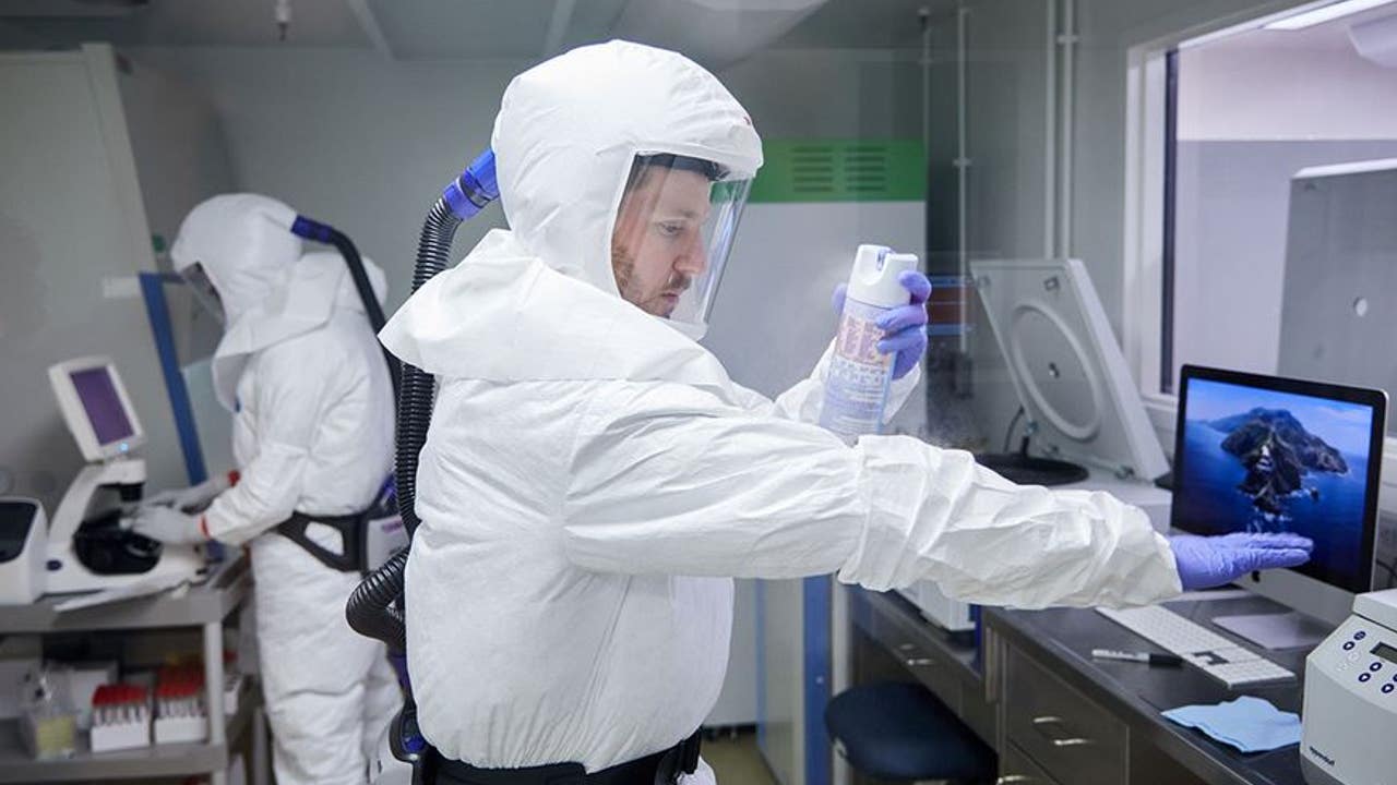 Brett Case sterilizes his suit with disinfectant spray before working with the virus that causes COVID-19. Case and colleagues at Washington University School of Medicine in St. Louis developed a mouse model of COVID-19 that will likely help scientists battling the disease. (Matt Miller/Washington University School of Medicine in St. Louis)