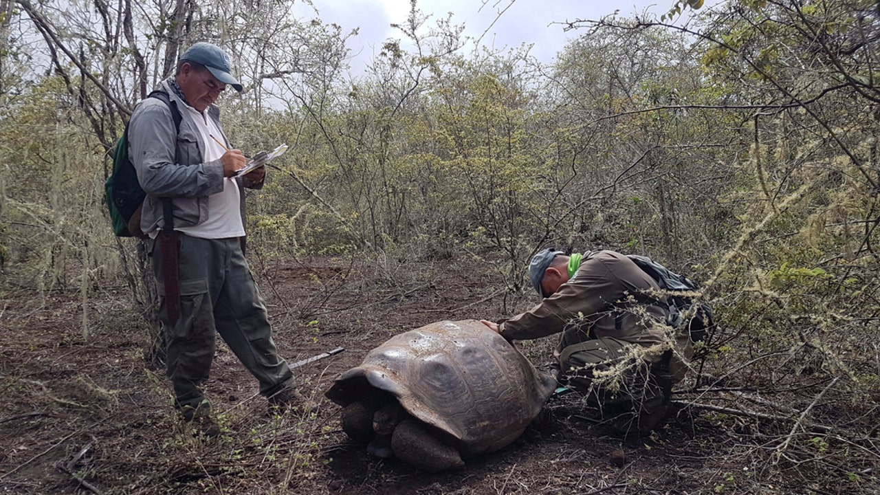 In this Jan. 25, 2020 photo released by Galapagos National Park shows park workers inspecting a tortoise near Wolf Volcano on Galapagos Islands, Ecuador. The National Park announced on Friday, Jan. 31, 2020 that an expedition to the foothills of the highest active volcano in the Galapagos Islands located a young female tortoise and she is a direct descendant of a giant tortoise species considered extinct. (Tui De Roy/Galapagos National Park via AP)