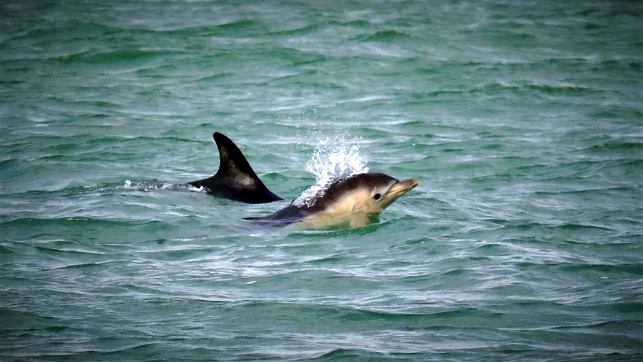 A Short Beaked Common Dolphin newborn calf spotted off the coast of Labrador Bay,Teignmouth, South Devon, Aug. 1 2019. (Credit: SWNS)